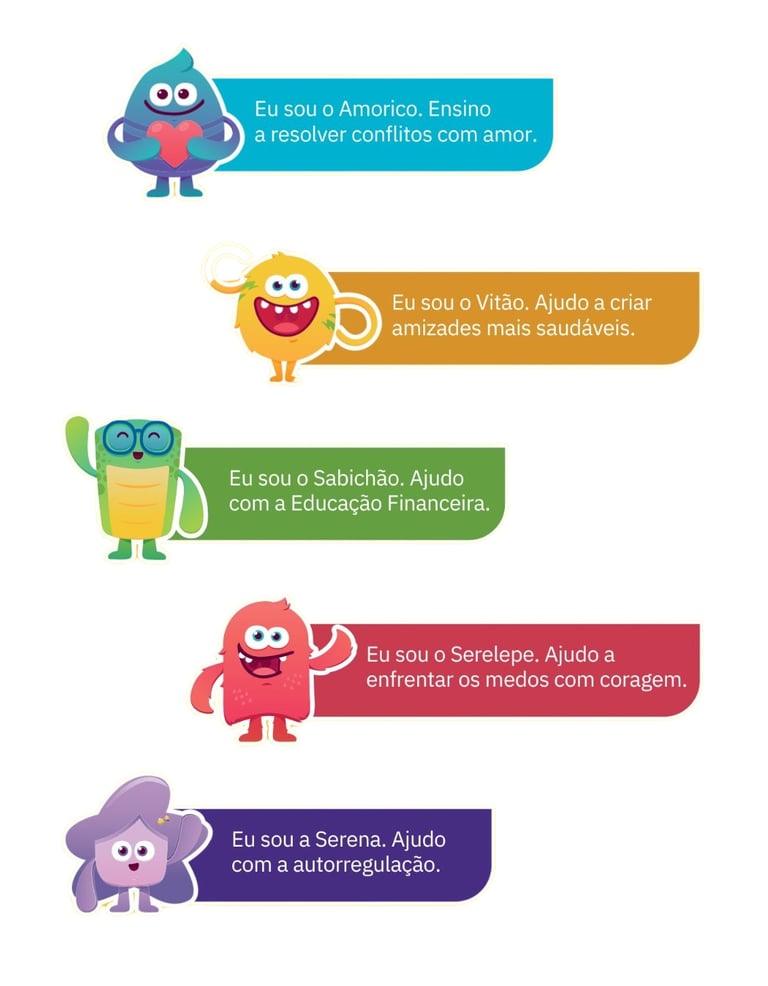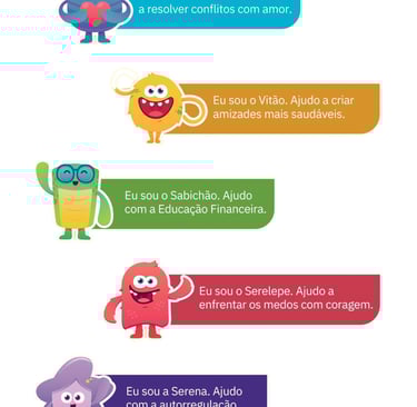 Os mascotes trabalham o Sócio Emocional, onde com a ajuda deles conseguimos trazer de forma bem lúdica assuntos necessários para a formação cidadã do educando. Eles estão bem presentes no dia a dia da escola e é um sucesso entre os estudantes.